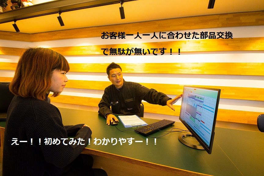 お客さんに合わせてどれくらい乗るか、買い替えの予定などあるかなど必要な部品を選んでもらえるので無駄な出費を抑えられます。こちらの部品は薬で言うジェネリックのような部品も使ってくれるので安く済むのだそう。ふむふむ
