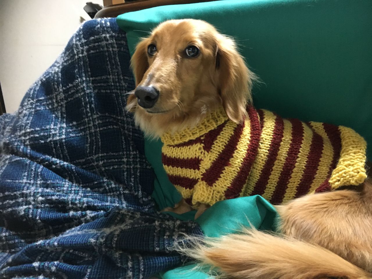 キャベツが大好きな男の子です。おかあさんがキャベツを切り出すと走って寄ってきます。ジャンプしすぎてヘルニアになってしばらくおとなしかったね。元気になったけどもうジャンプしないでね。編んでもらったベストを着て記念撮影