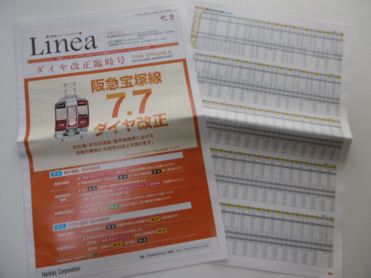 2018年06月27日 【阪急宝塚線】7/7にダイヤ改正 カテゴリ:話題街ネタ・スポット 阪急電車の駅にポスターが掲示されていました。どうやら宝塚線のダイヤが変わるようです。こんな冊子も、駅構内のラックにありました。平日朝、夕方の通勤・通学時間帯の混雑緩和と利便性の向上を図るためのダイや改正で、能勢電鉄も同じ日にダイヤ改正を実施予定だそうです。※阪急電車webより抜粋詳しくは、この冊子か、また改正が近くなったら各駅で新しい時刻表が置かれることと思うので、チェックしてくださいね。以上、宝塚と周辺の情報をお届けするComipa!編集室(KI)でした。 「話題」カテゴリの最新記事 【6/26のTV】ごぶごぶは宝塚出身の女優がゲスト!【オアシスタウン伊丹鴻池】ふわっふわの台湾かき氷をKANOKAで!