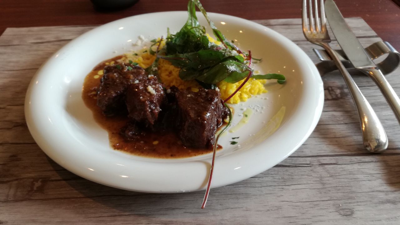 赤ワインで柔らかく煮込まれていて (香りがします) ボリュームがありました。サフランライスも付いています。