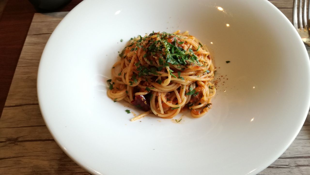 次にそれぞれが選んだ パスタ料理です。嬉しいことにどれも熱々です。まずは 私のイワシのぴり辛トマトソース。