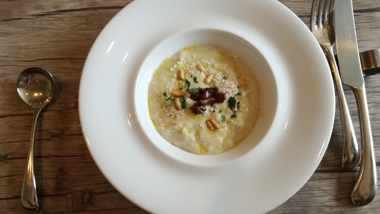 なすのスープなんて食べるのは初めてです。冷たくてなすの香りがし、時々柔らかいナスの触感があたり、食べるスープという感じす。松の実や焼いたナスが浮かび、とても美味しいかったです。