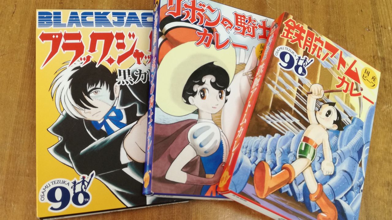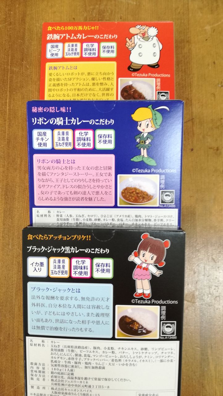 昨年秋より、宝塚北サービスエリアにて限定販売されている、3種類の手塚治虫キャラクターカレーに加えて、今回市内でも購入できるようになり、パッケージも90周年生誕用になったという代物。