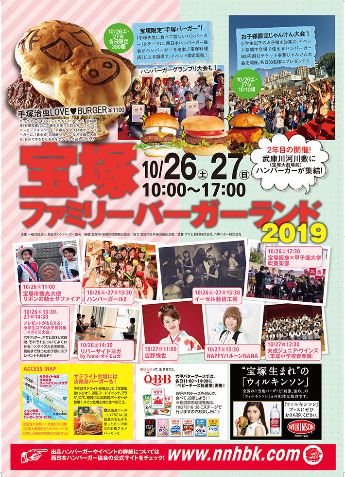 昨年25,000人を集客した『宝塚ファミリーバーガーランド』が 今年も武庫川河川敷(宝塚大劇場前)にて開催。全国のハンバーガーが集結します。(10/27(日)同時開催 宝塚アニメフェスタ2019×ハロウィン)