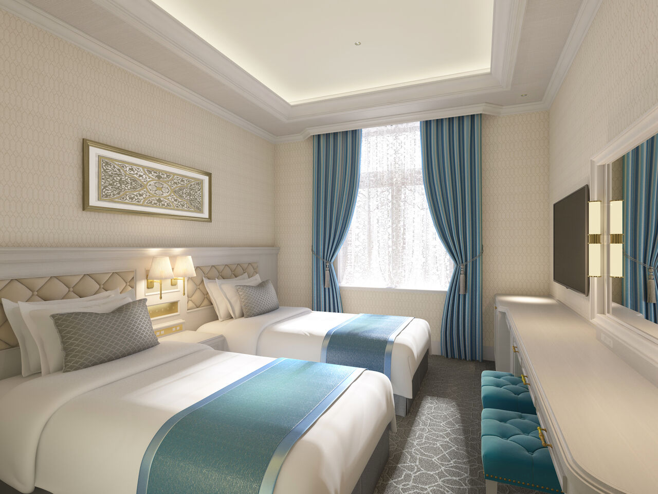 エレガントな雰囲気の客室デザイン。華やかな表すデザイン「エレガンス」や清らかで落ち着きのある印象の客室「グレース」、ビジネスユースにも対応できる落ち着いた色調のクラシックかつシックな雰囲気の客室「モノトーン」など、メインコンセプトでもある「夢のつづき」に浸っていただける3タイプのカラースキームをご用意。