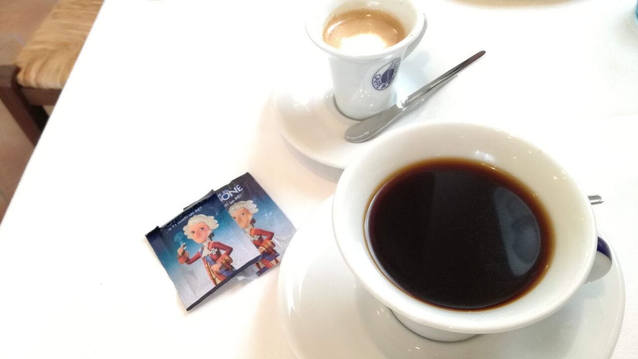 ラストの飲み物は、私はイタリアンコーヒーでしめました。友人はミルクの入ったマキアートを注文。