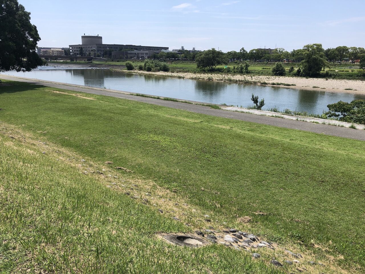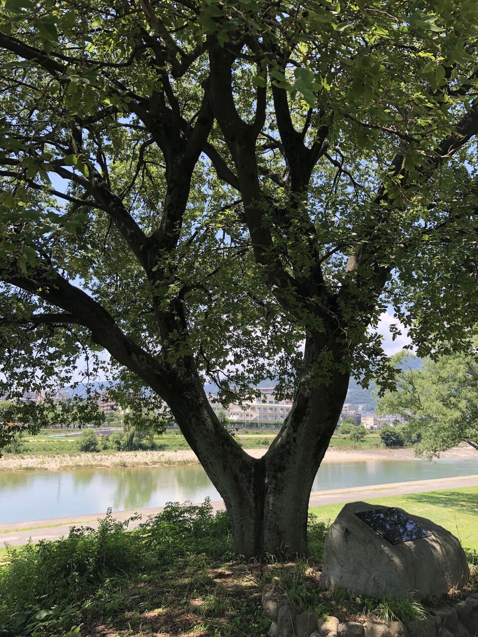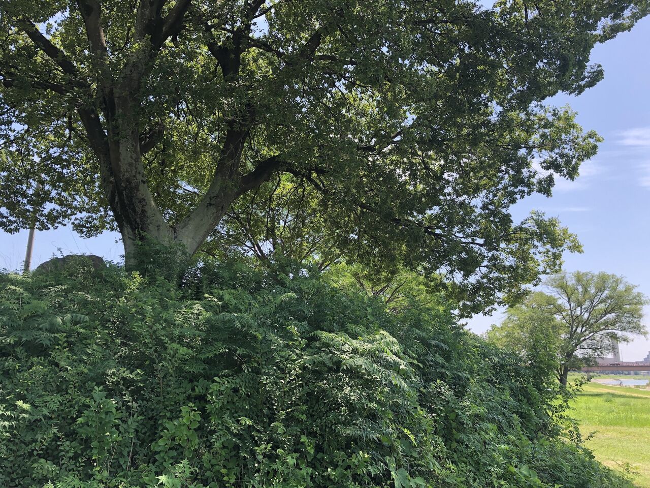 そして、最初にお見せした写真の木の所に来て、あの石はなんだろう…と上に上がってみました(河川敷から上がっても、歩けるところがあります)。