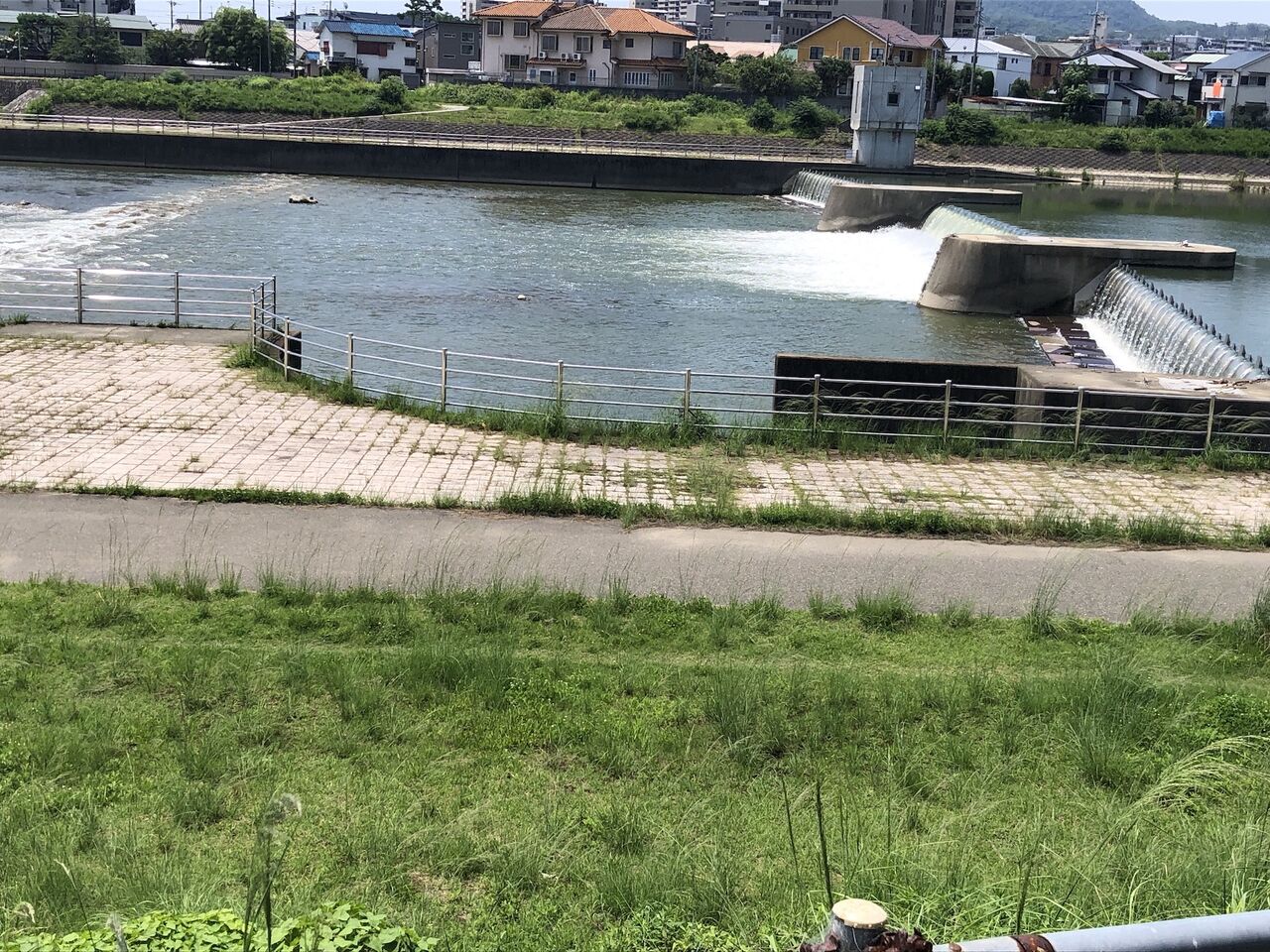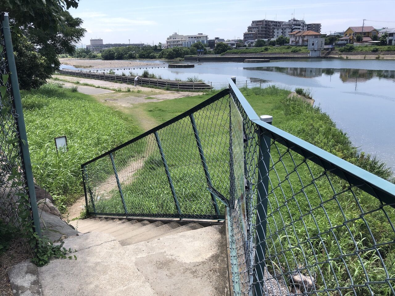 階段を降りると…ちょうど荒神川が武庫川に流れ込んで合流している地点です。