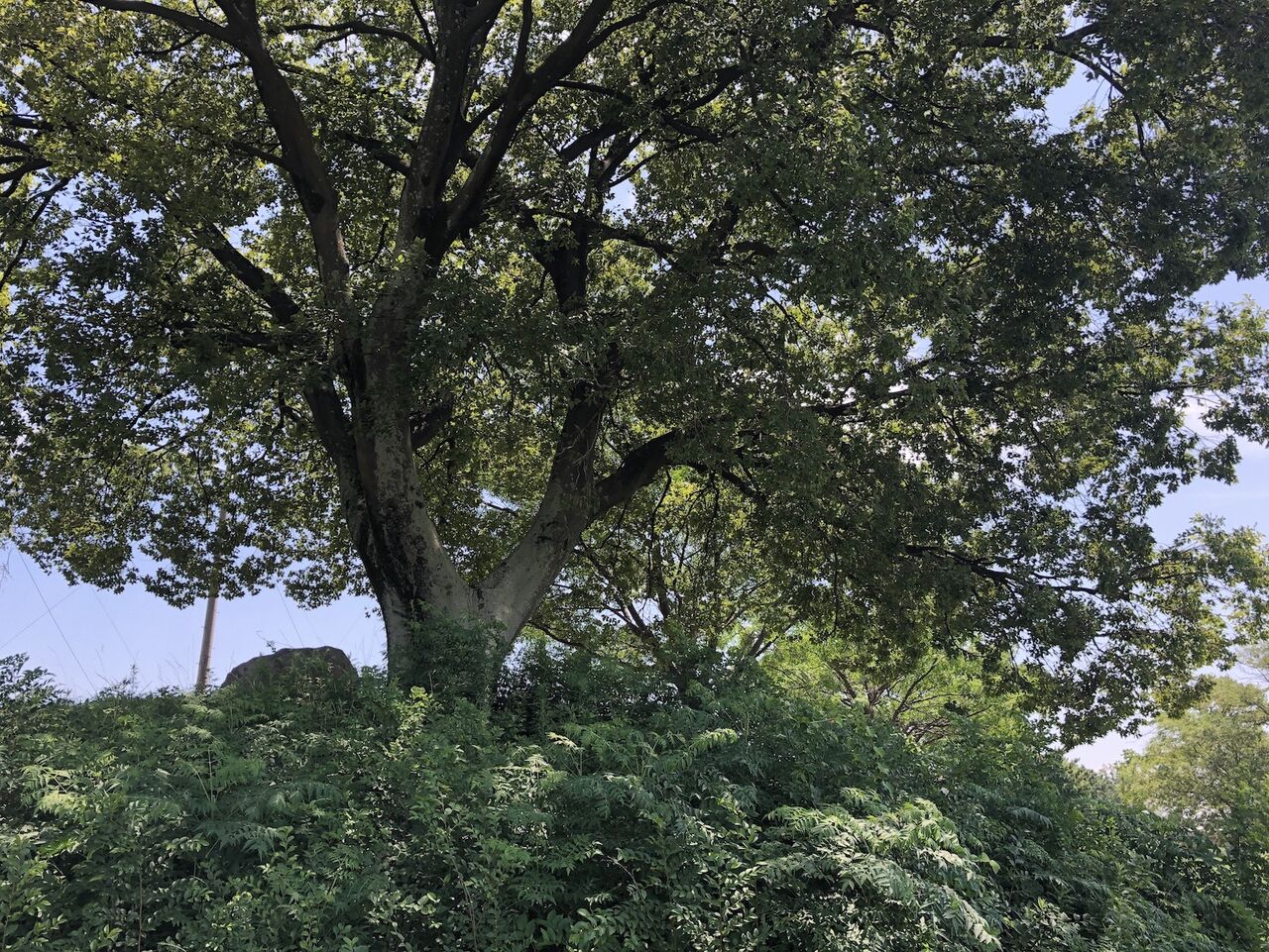 大きな木があります。木の左側には、なにか石?も見えます。