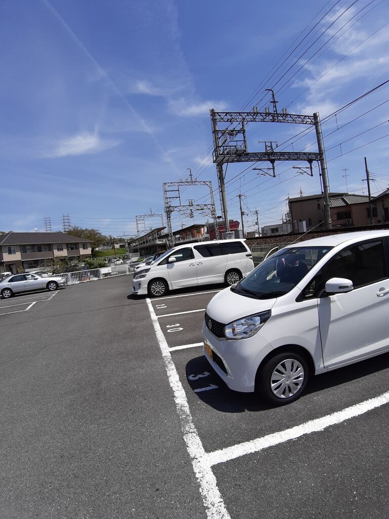 駅のホームが見える距離で、駐車場もあり。(時間貸しと一緒になっているので置いても良い場所はご確認ください)