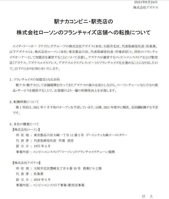 駅ナカコンビニ・駅売店『アズナス』が株式会社ローソンのフランチャイズ店舗へ転換されます。