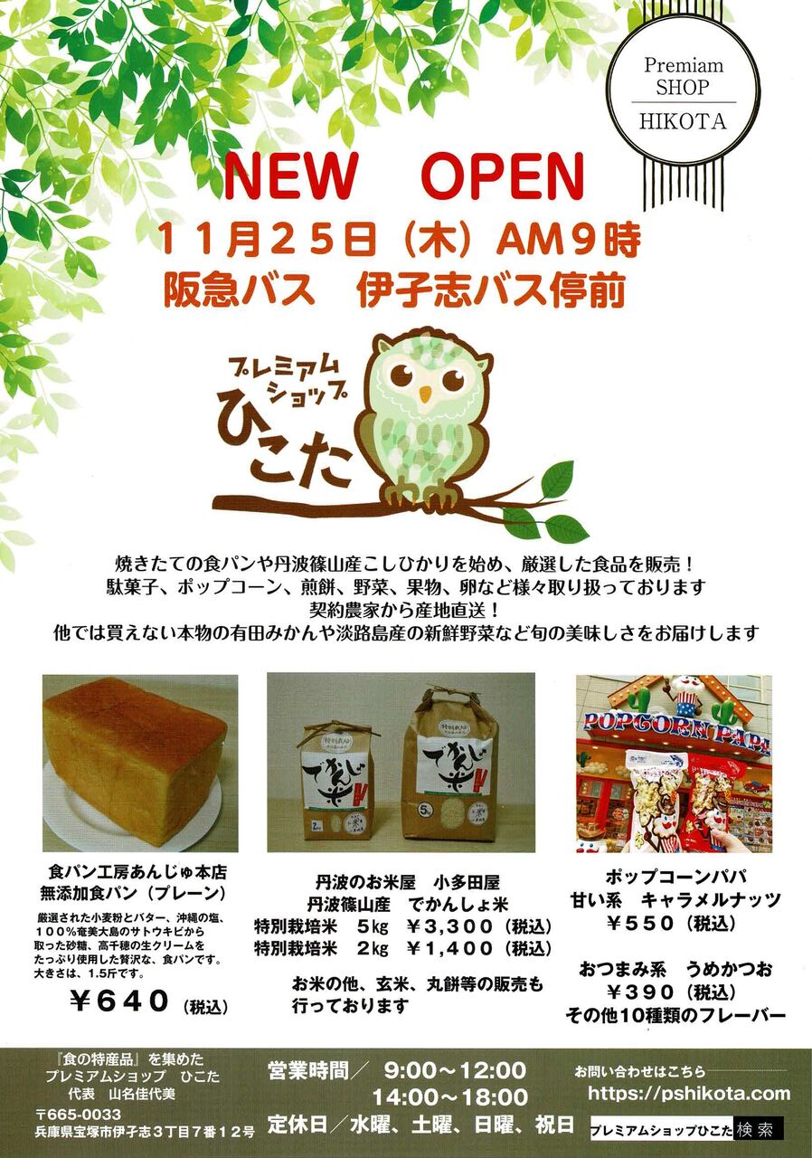 お店の名前は、「プレミアムショップ ひこた」。阪急バスの伊孑志バス停の真ん前です。