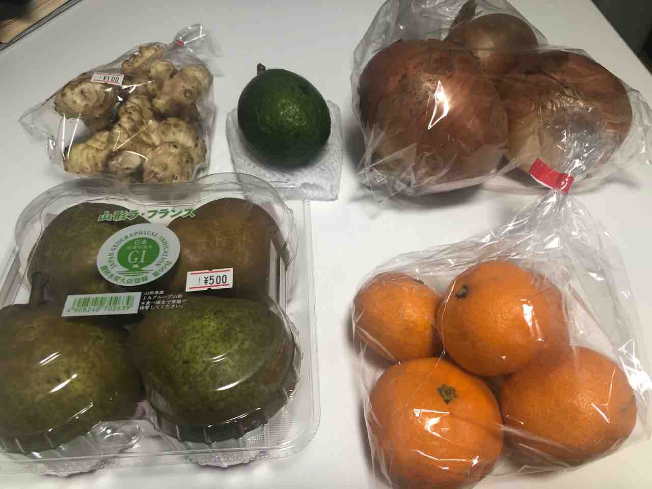 生産地に行かないと、買えないかな?あんまり見たことない、国産和歌山県産のアボカド(130円)、山形のラフランス(500円)、高知産のきくいも(100円)、有田みかん(250円)、淡路のでっかい玉ねぎ(200円)を買いました!(お値段はこの日の価格です)