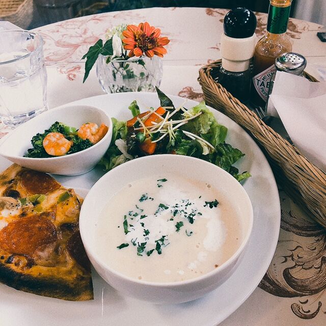 クラムチャウダーとピッツァ、サラダがプレート上に並びます。