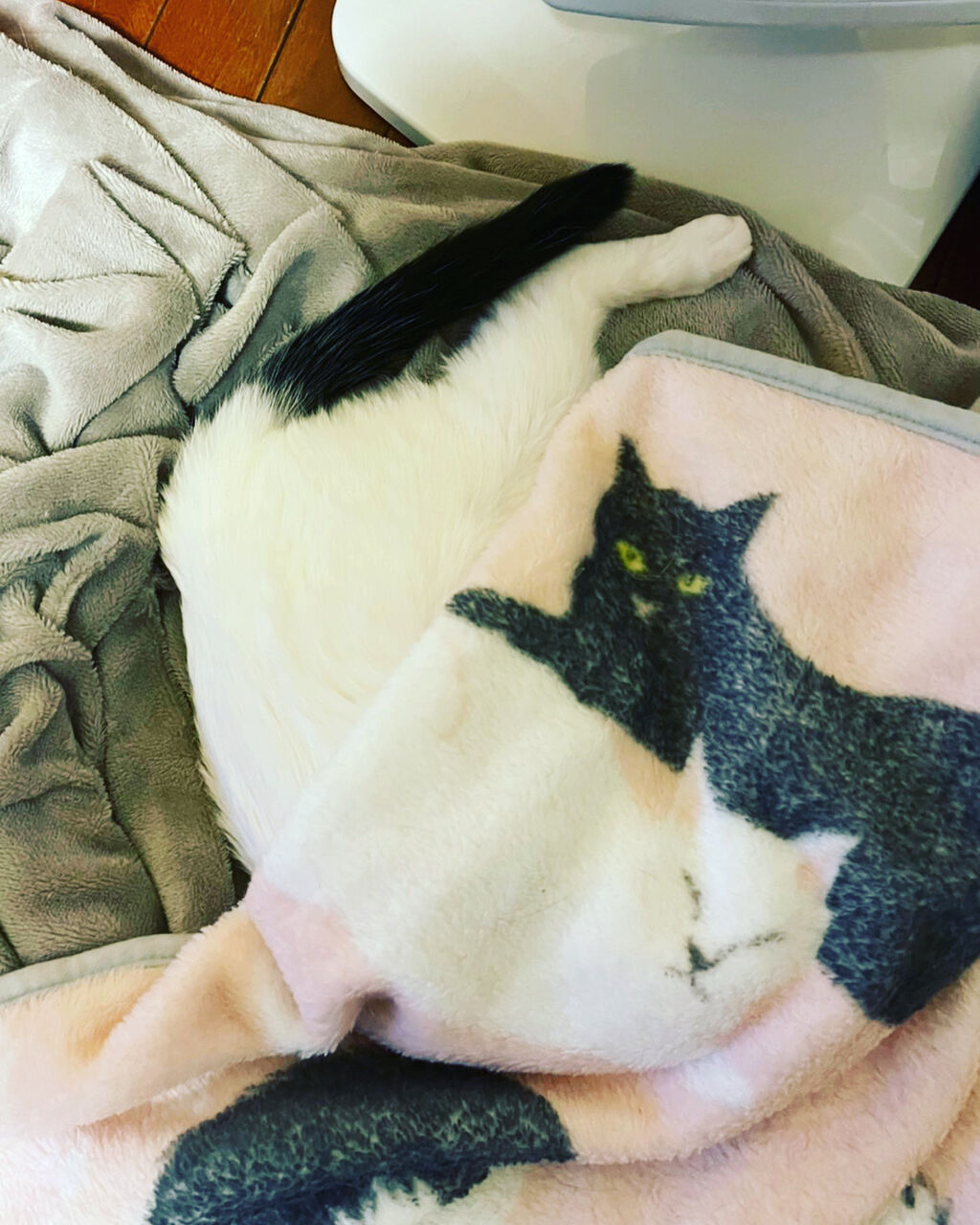 これは、人間模様ならぬ、ペット模様が垣間見られた1シーンです。猫ちゃんは、先ほどの毛布と同化した猫ちゃんですね。 心配そうに見つめています。可愛いお顔が見られて良かった!