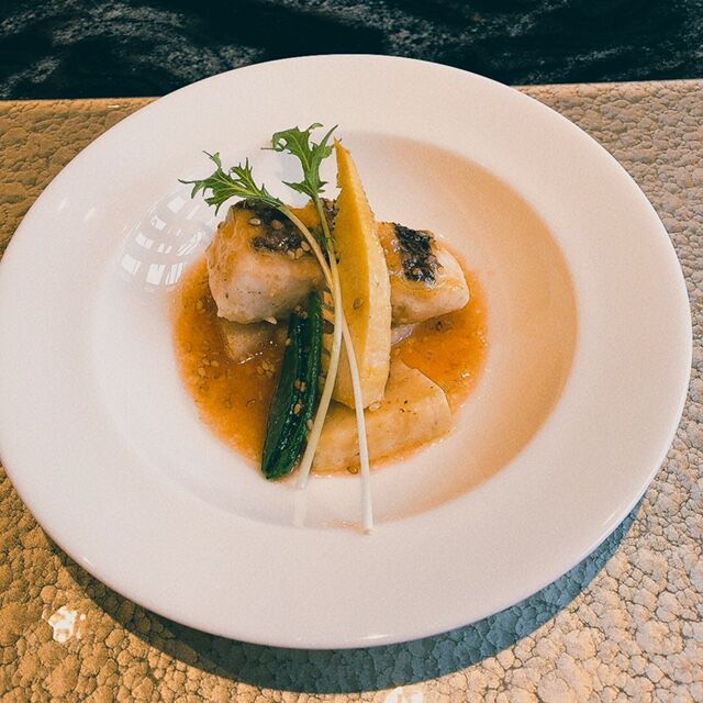 白身魚(おそらく鯛)とタケノコと梅ソースがかかってのお魚料理。