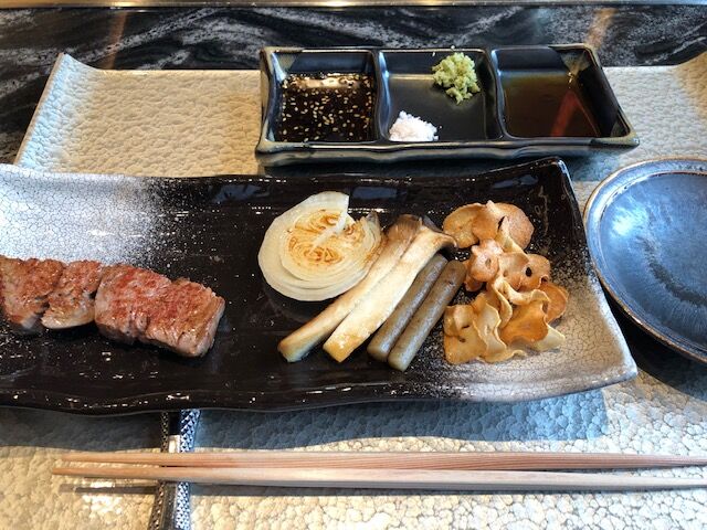 ステーキには岩塩、ワサビ、ポン酢をそれぞれ好み次第でつけます。私はワサビが好みです。