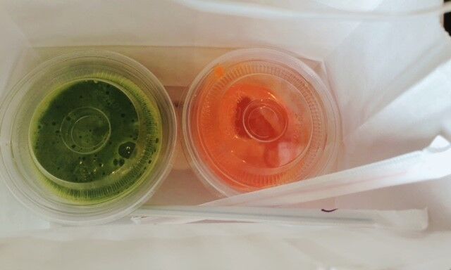 左の鉄分いっぱいスムージーは、家人に。小松菜とは思えないと…