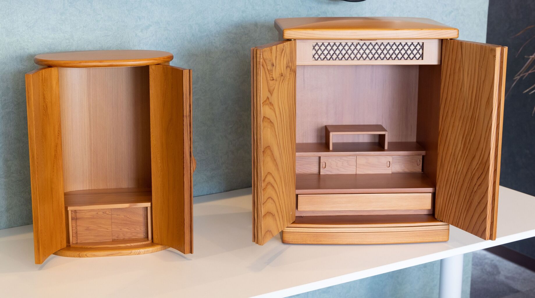 「リビングに置けるようなデザインのものが欲しい」「我が家は狭いので小さめがいいのですが」といった方の要望にお応えする仏壇・仏具のセットもご用意できます。明るい色味のタモ材や、棚の上置きにできる家具調の仏壇(国産材使用→黒部杉)などもあります。