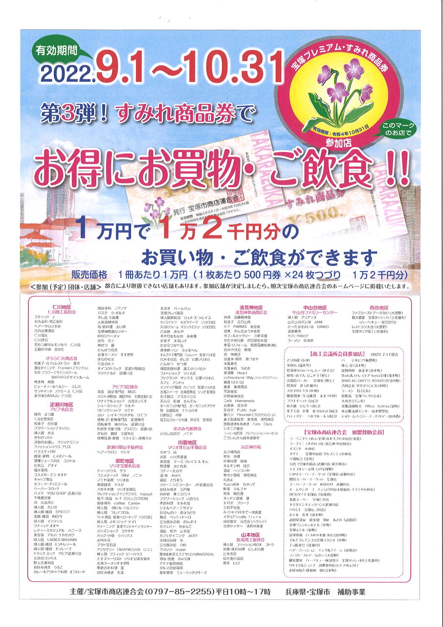 今年もプレミアム付き商品券「すみれ商品券」が発行されます。スーパーや宝塚阪急、宝塚ホテルなどでも使えるのでお得です。