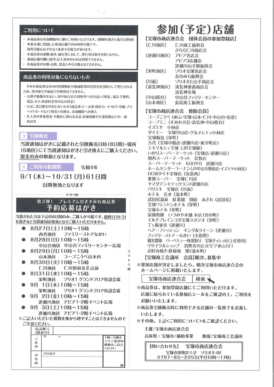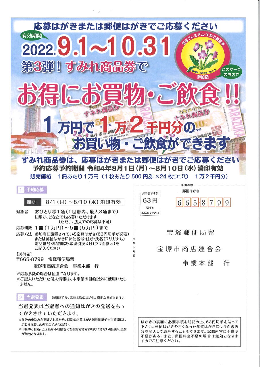 宝塚市商店連合会(〒665-8799 ) 宝塚郵便局留 宝塚市商店連合会事業本部行)へ郵送。