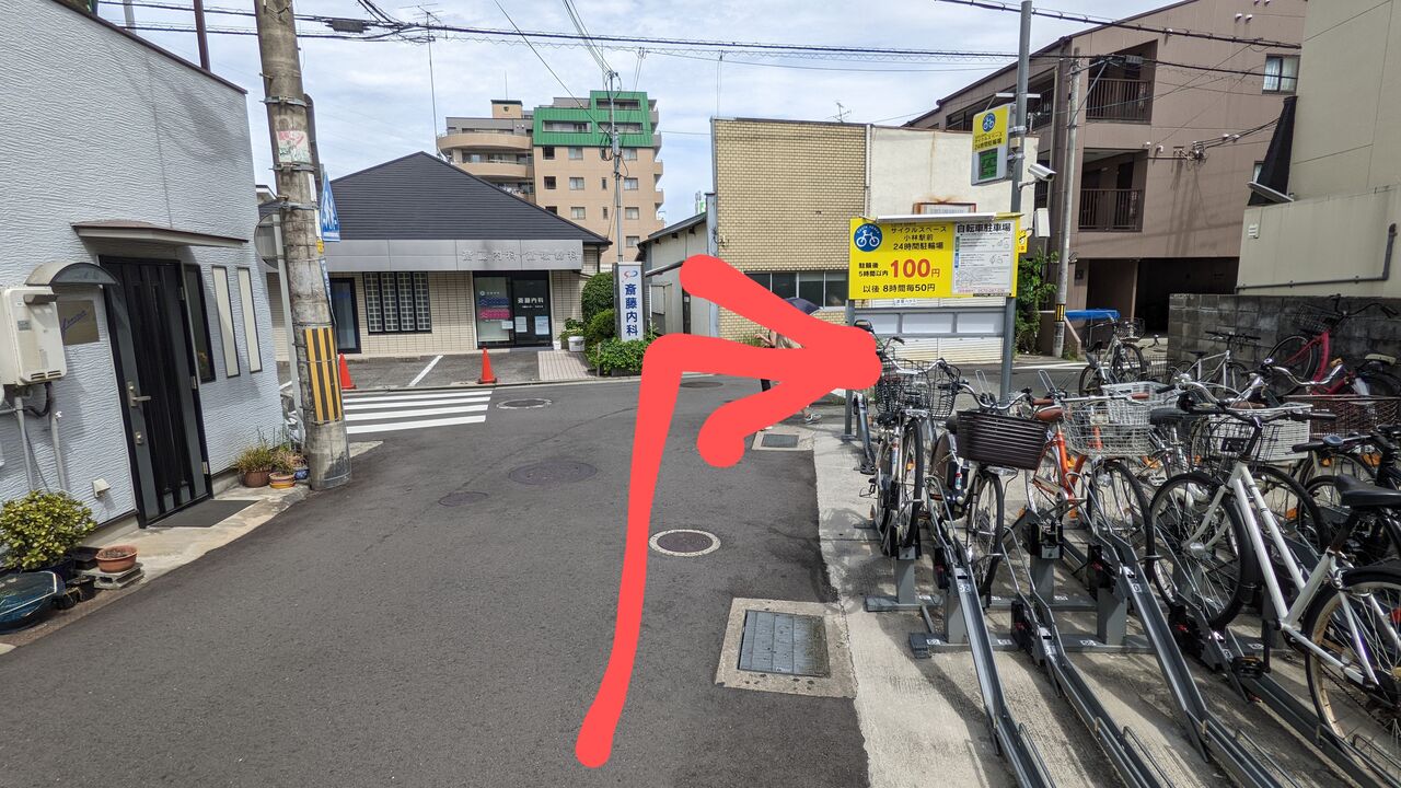 下り坂の突き当り、自転車置き場を右折します。
