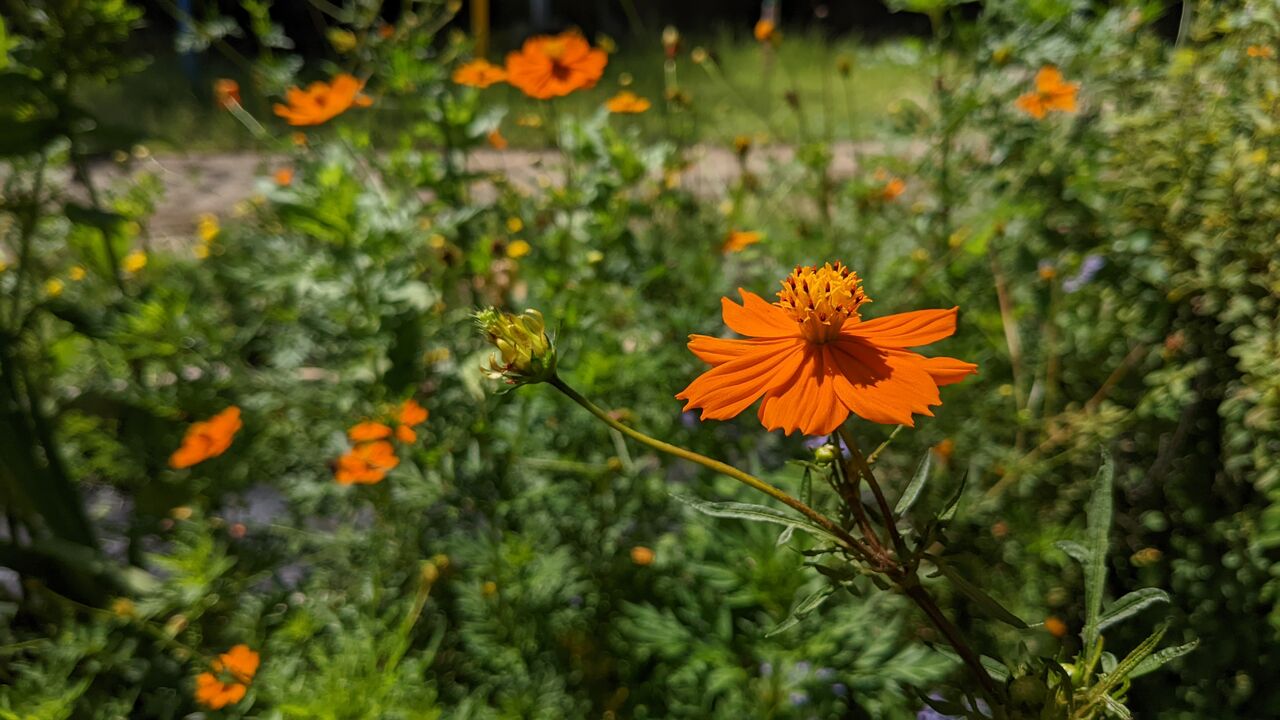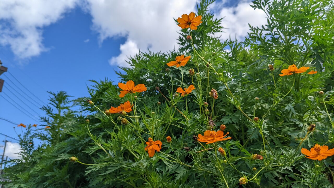 青空に映える、元気なオレンジ色のコスモスに思わず目を奪われました。