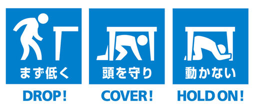 訓練の合図で、その場で約1分間、安全行動「DROP(まず低く)」「COVER(頭を守り)」「HOLD-ON(動かない)」をとってください。