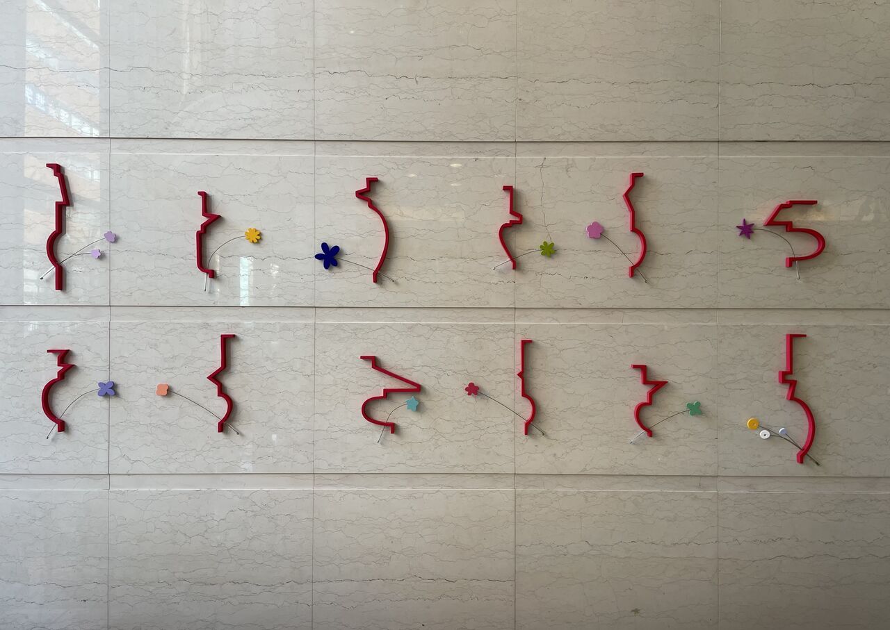 赤いラインのさまざまな横顔に、カラフルなお花