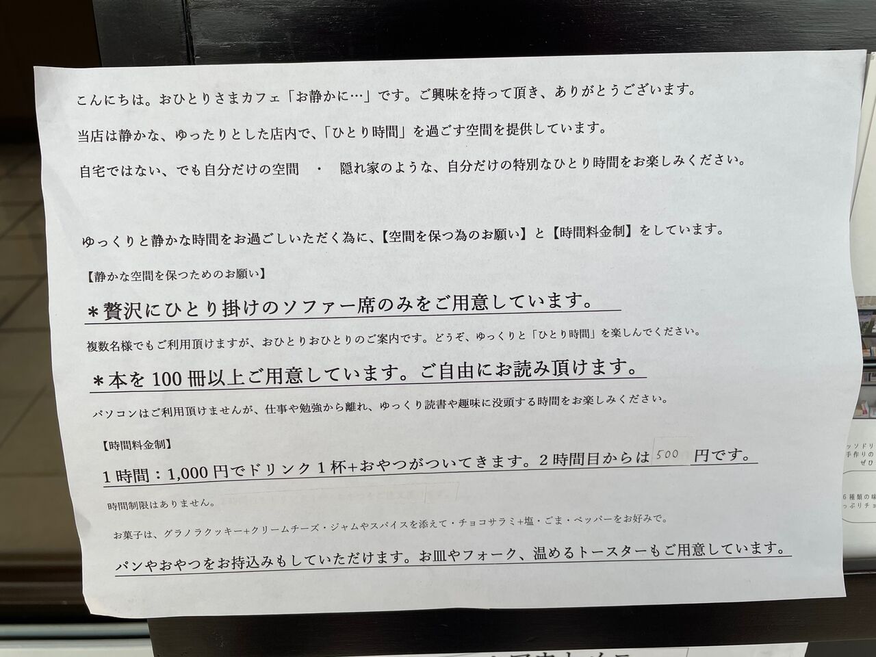 ひとり専用カフェ「お静かに…」。