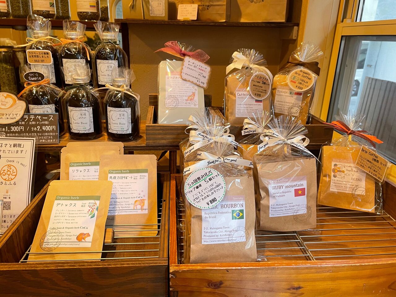 店内にはたくさんのコーヒー豆やギフトによさげなドリップパックなども並べられています。カウンターの上に“ふるさと納税”のポップがありました。宝塚市のふるさと納税返礼品にも登録されているようですね。