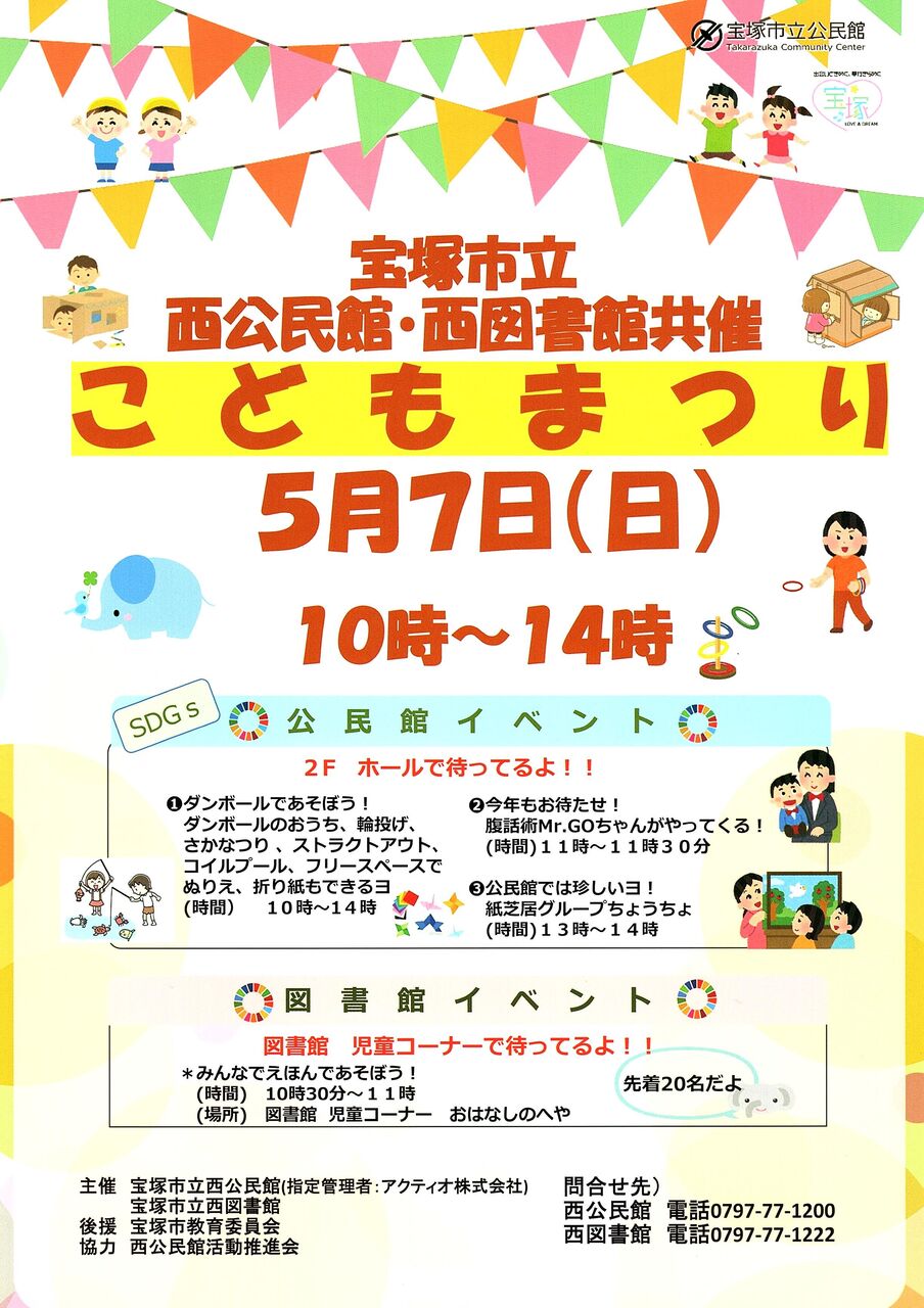 阪急小林駅近くにある西公民館と西図書館との共催となるイベント『こどもまつり』が、来月5月7日(日)に開催されますよ~!