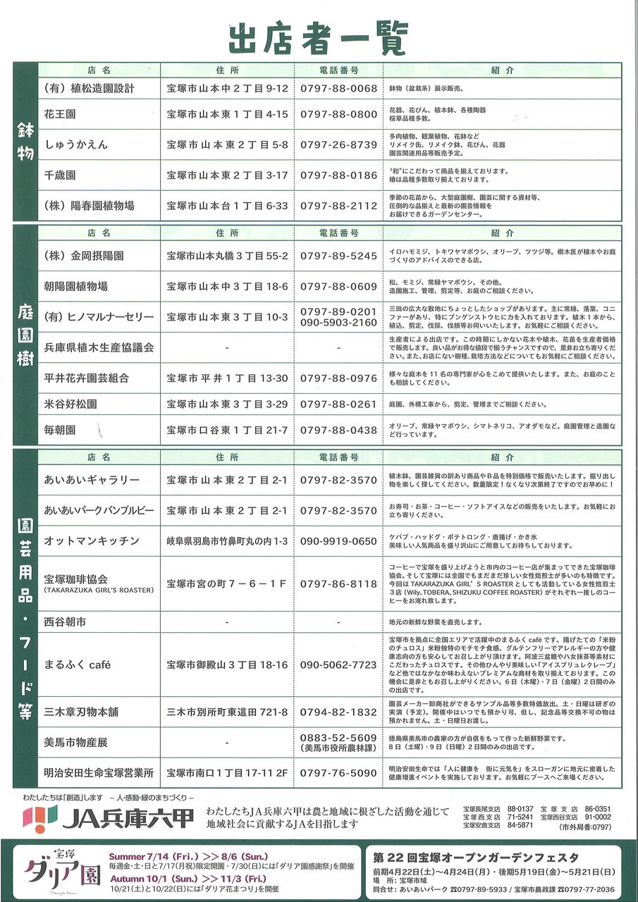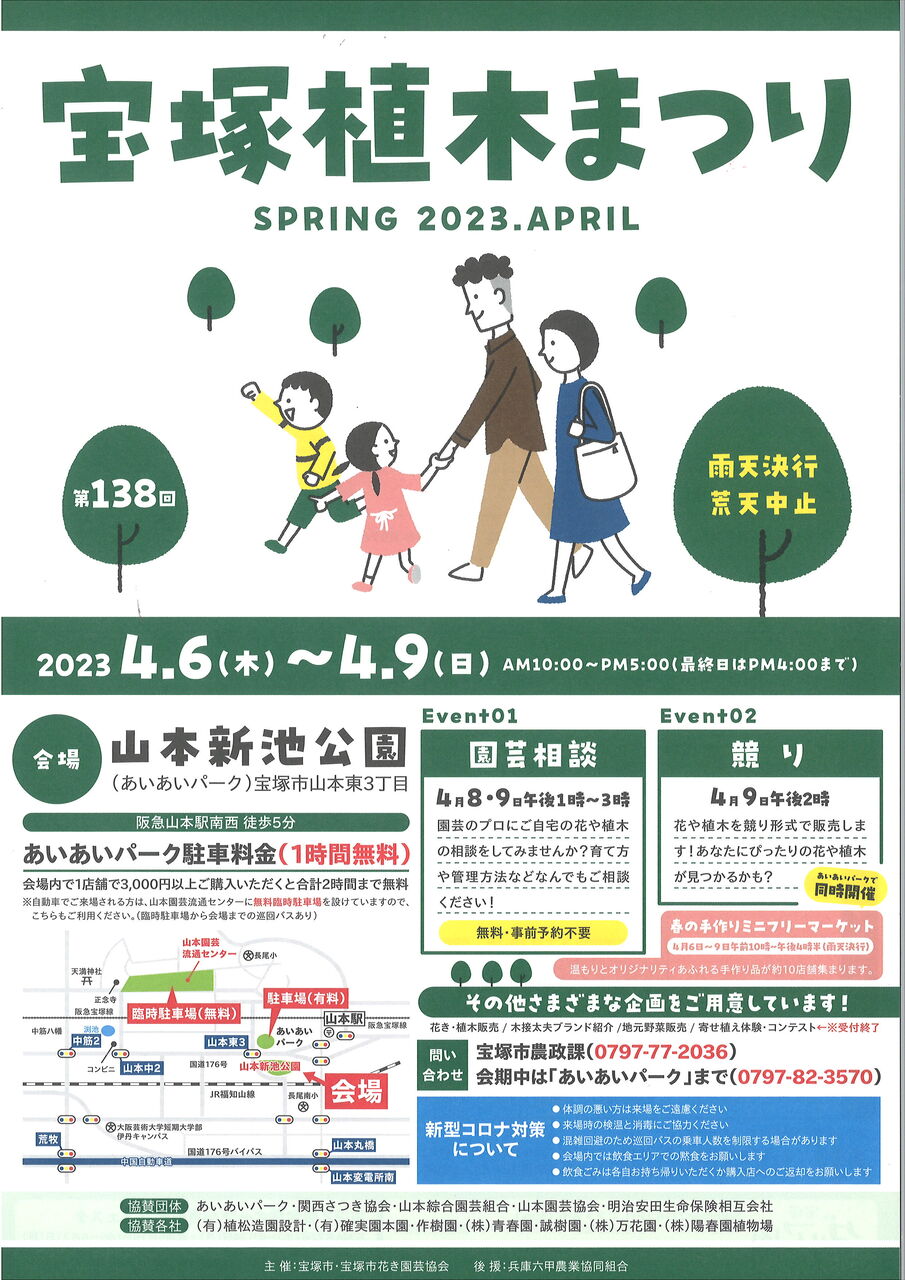 2023年04月05日 【宝塚市 イベント】『宝塚植木まつり』【春】4/6(木)~4/9(日)開催のお知らせ カテゴリ:話題イベント・お知らせ 宝塚市といえば、花き植木産業の街。『植木まつり』開催当日は、花苗や植木の販売をはじめ、西谷野菜の販売、競り等を実施いたします。詳細内容は以下のチラシをご覧ください。以上、宝塚コミパ通信SAでした。 タグ :#宝塚市#宝塚市農政課#イベント#植木まつり#山本#あいあいパーク 「話題」カテゴリの最新記事 【宝塚市 寄席】売布神社駅に隣接するピピアめふ和風ホールで『第129回 めふ乃寄席』を開催♪【宝塚市 習い事】「カルトナージュ」始めませんか?アトリエ トゥトゥネッ【PR】
