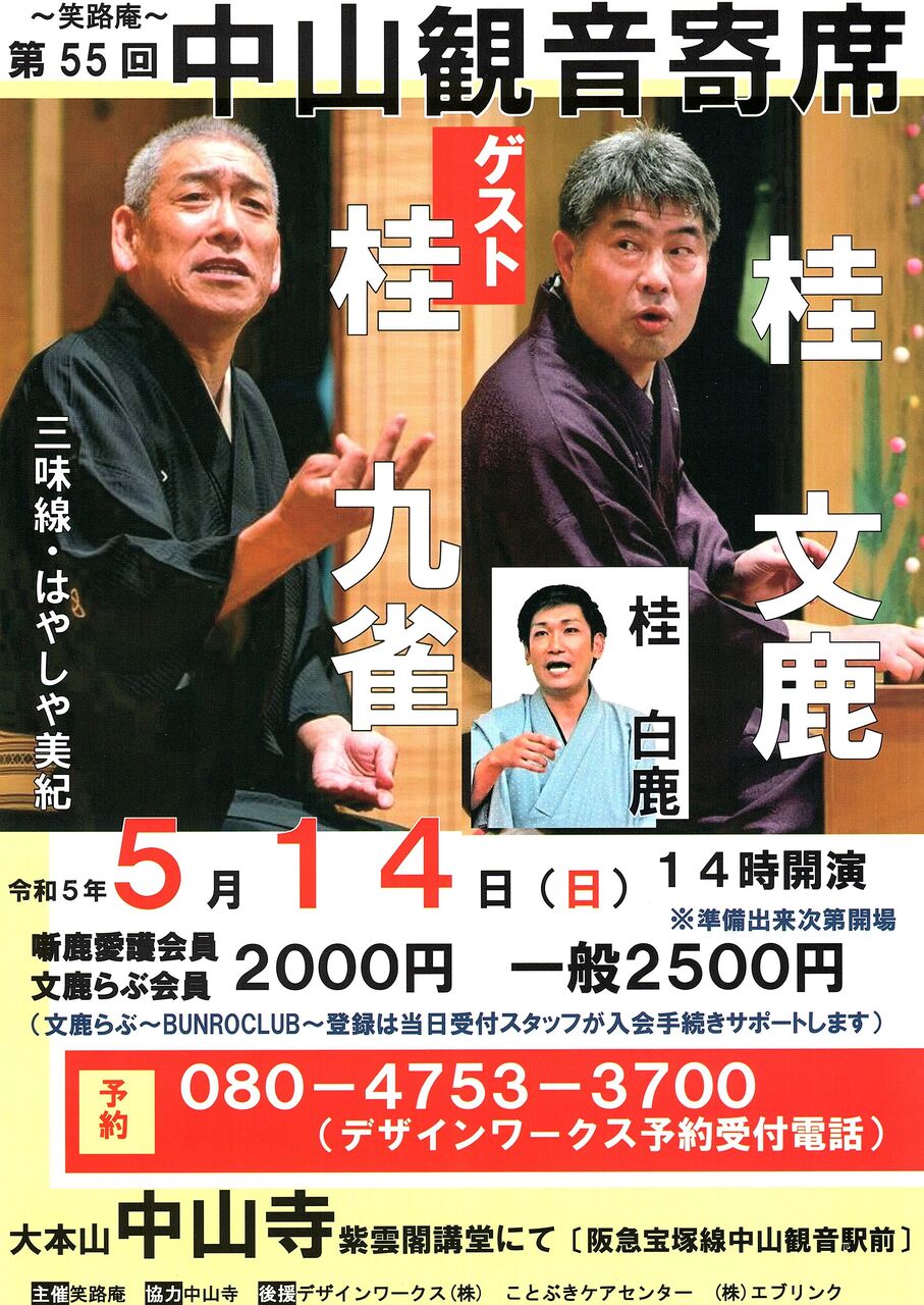 第55回目となる今回の寄席は、5月14日(日)に開催されます! 今回は、桂文鹿さん、桂九雀さん、桂白鹿さんが高座に上がられますよ!