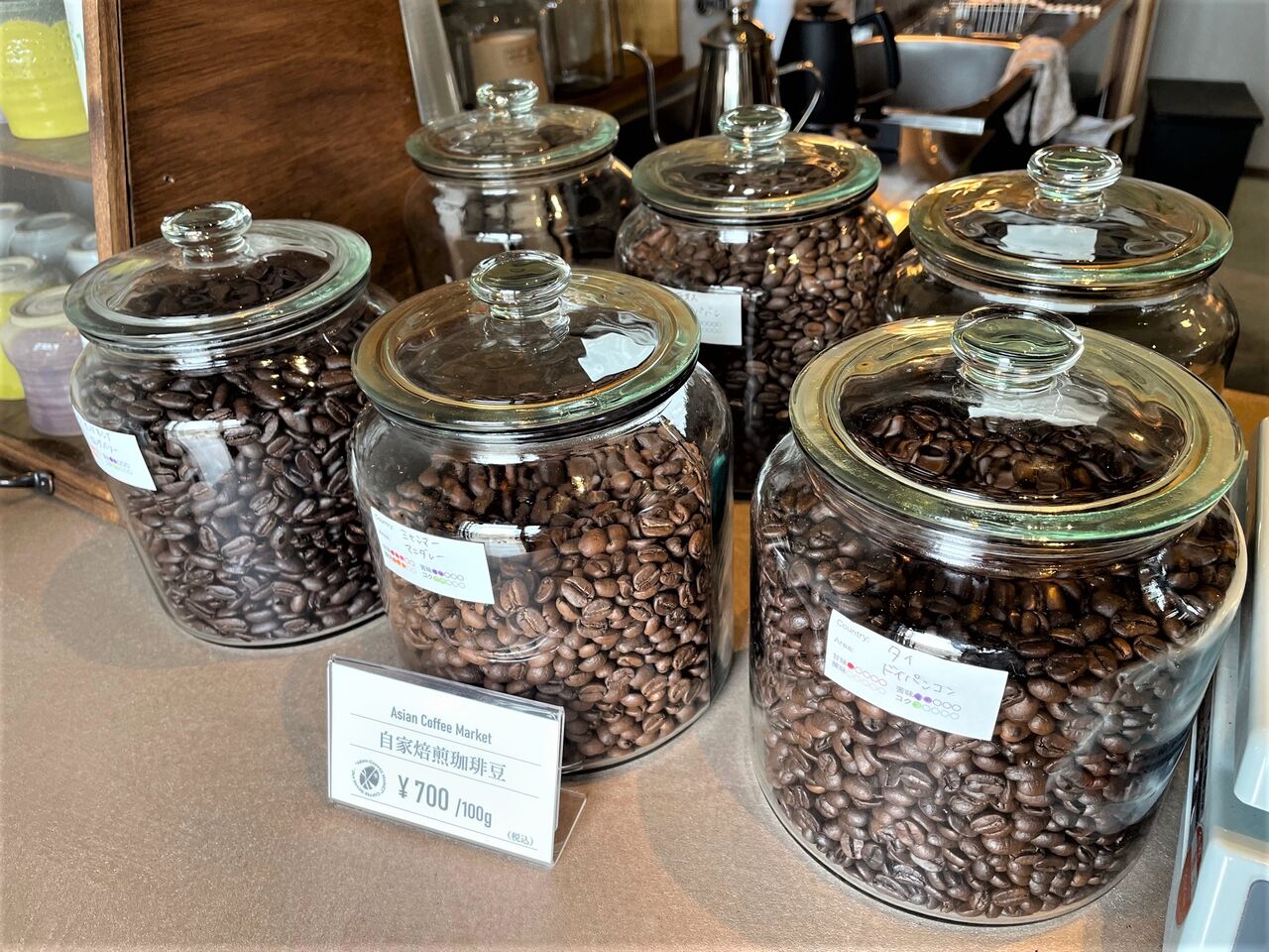カウンターには焙煎されたさまざまな豆が並んでいます。ラベルを見ると“ラオス”や“タイ”、“ミャンマー”、“インドネシア”…と、確かに一般的なコーヒーショップではあまり馴染みのない国の名前がズラリ。どんなお味なのかも、ちょっと想像がつかない~けど気になる~~。