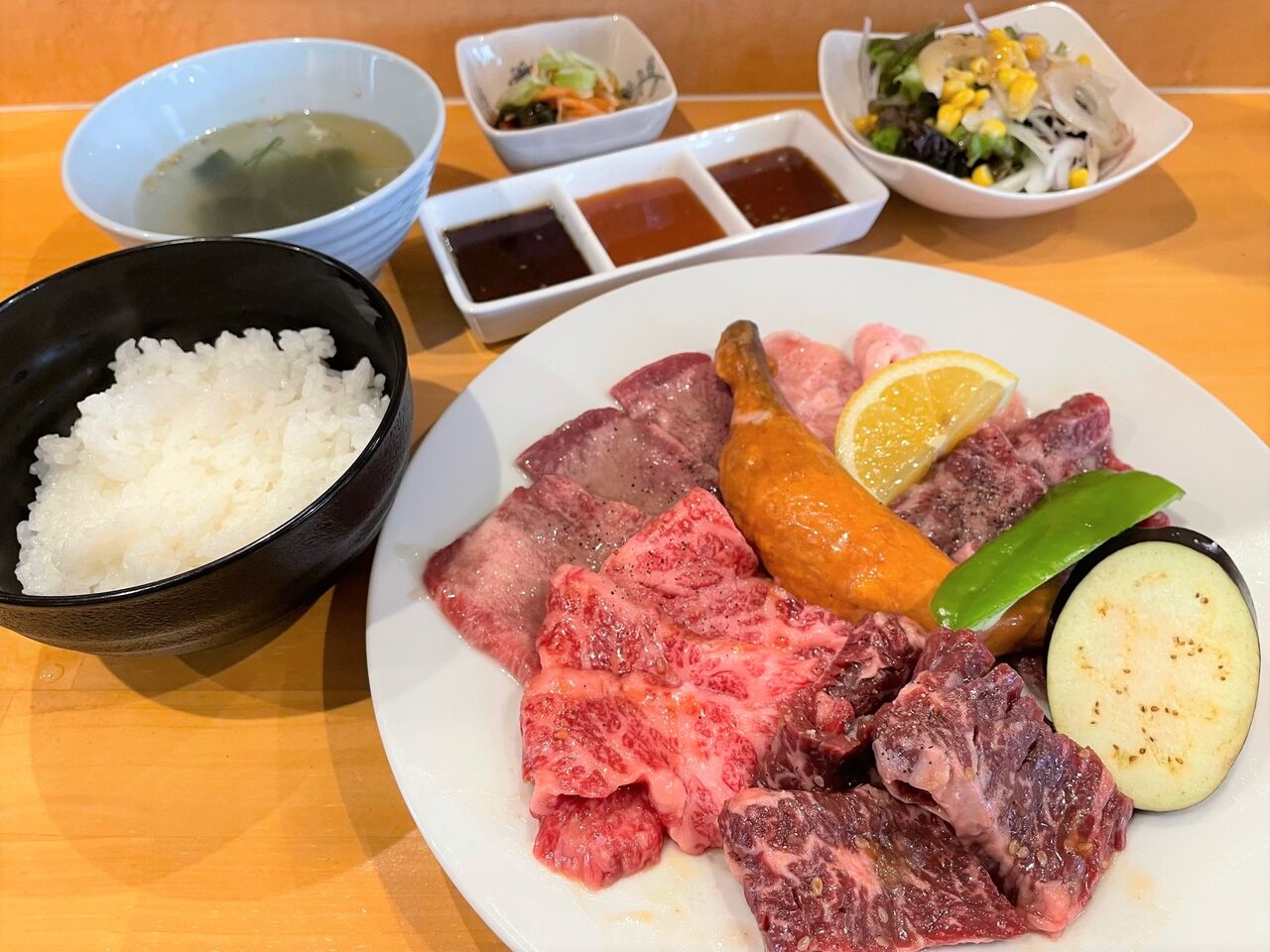 ランチは2種類。豚トロ、鶏モモ、ウィンナー、ハラミ、サガリ、タン先、カルビがセットの「勲ランチ」は1,300円。上タン、上ハラミ、上カルビ、骨付きウィンナー、上ロース、豚トロ、デザートがセットの「上ランチ」は1,980円です。どちらにもキムチ、スープ、サラダ、ライスが付きます。