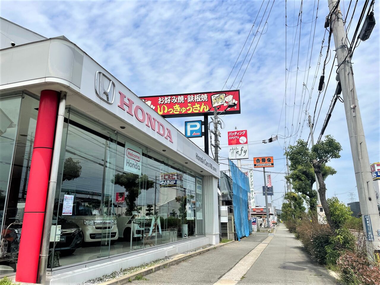 場所は安倉中交差点を大阪方面へ少し越えた、Honda Carsと吉野家の間になります(写真の青い工事幕のあたりです)。