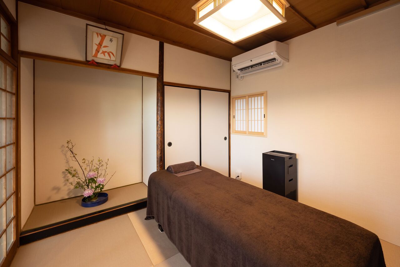 平井山荘の閑静な住宅街にある整体院で、お庭から院内まで、しっとりとした和のしつらえが落ち着きますね。静かに流れているBGMも癒されます。