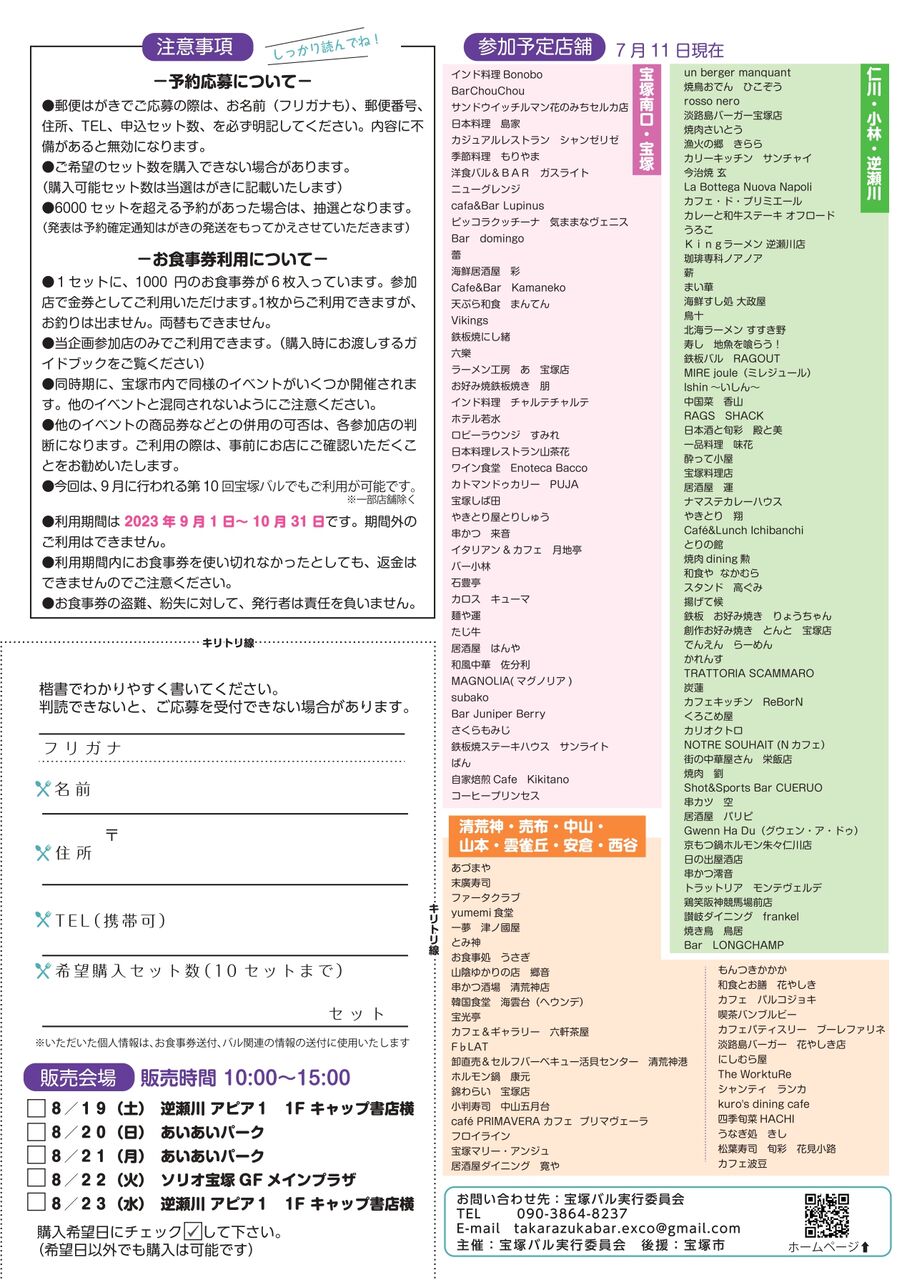 チラシにある予約はがき、もしくは郵便はがきか、公式HP内にある予約ボタンのリンク先フォームより予約すると、事務局より8月10日頃に予約確定通知はがきが発送されます(応募多数の場合は抽選、落選通知連絡はなし)。