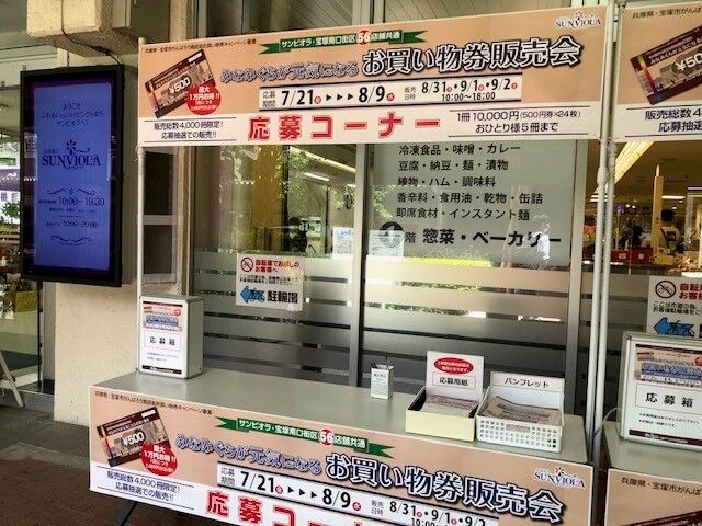 サンビオラ及び宝塚南口街区56店舗のお店で使用できるお得なお買い物券を販売。お買い物券は、1冊10,000円で12,000円のお買い物・飲食ができます