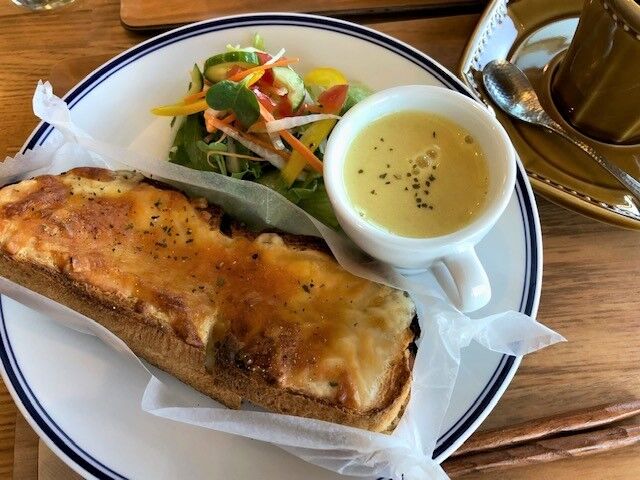 3種のチーズは(モッツァレラ・ゴーダ・エグモント)と書いてありました。手作りパンもカリッと、たっぷりのチーズと絡まって嚙むほどに味わい深い。スープはコーンスープでした。サラダと共にとっても美味しくいただきました。