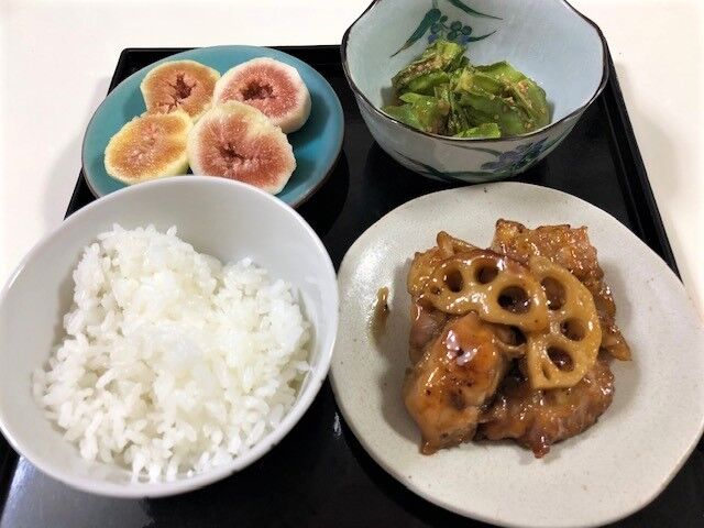 左は濃厚な白イチジクとドーフィン種のイチジクです。四角豆は酢味噌ゴマ和え、レンコンは鶏肉と照り焼きにしていただきました。季節のお野菜はいいですね。