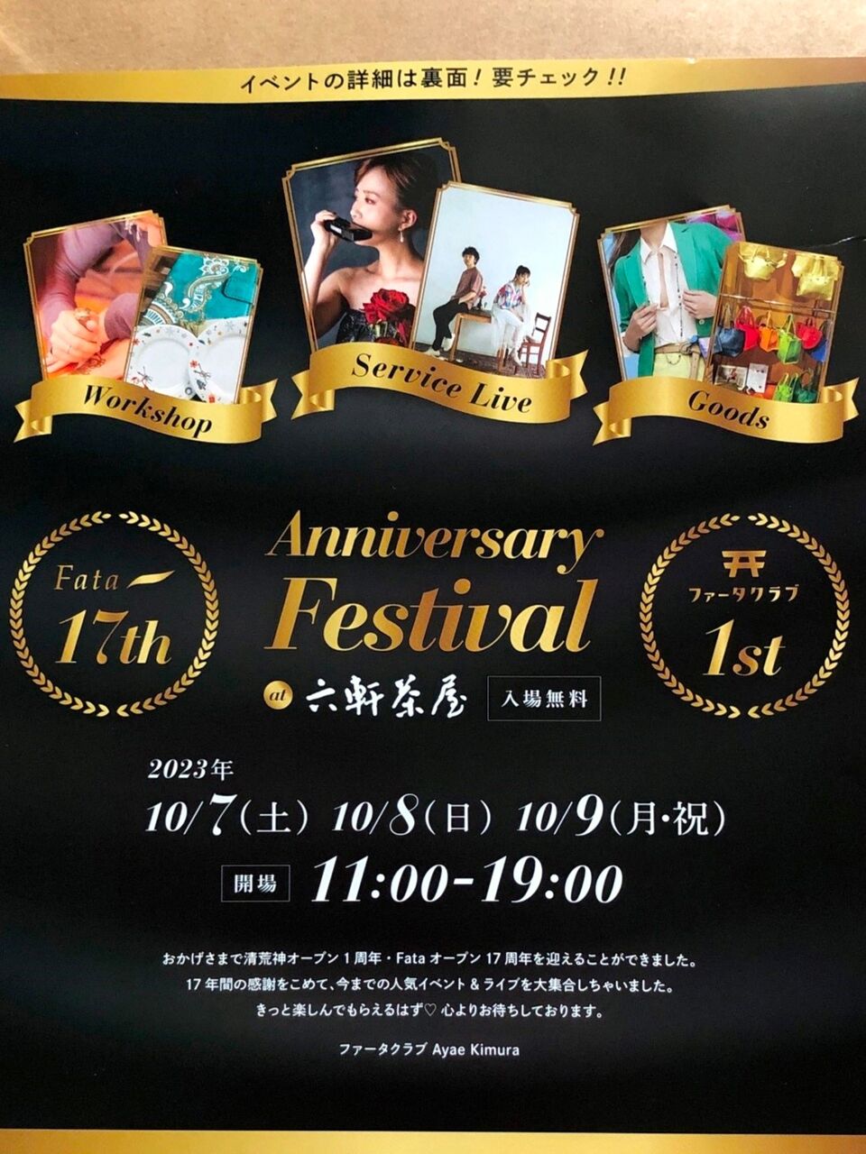 阪急清荒神駅北口から徒歩1分にある『ギャラリー六軒茶屋』にて、Fata17周年と、清荒神にファータクラブをオープンして1年を記念したお祭り「Fata17th Anniversary Festival ファータクラブ1st」が、秋の連休10月7日(土)・8日(日)・9(月祝)に開催されます