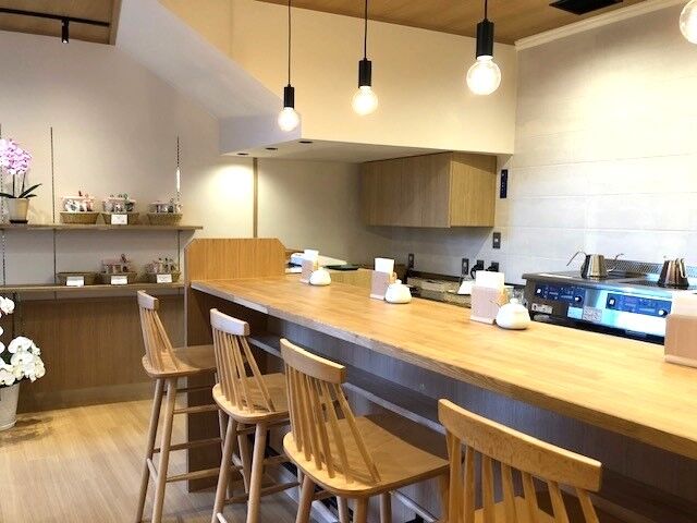 店内に入ると先ず白木のカウンター席があり、照明もお洒落です。