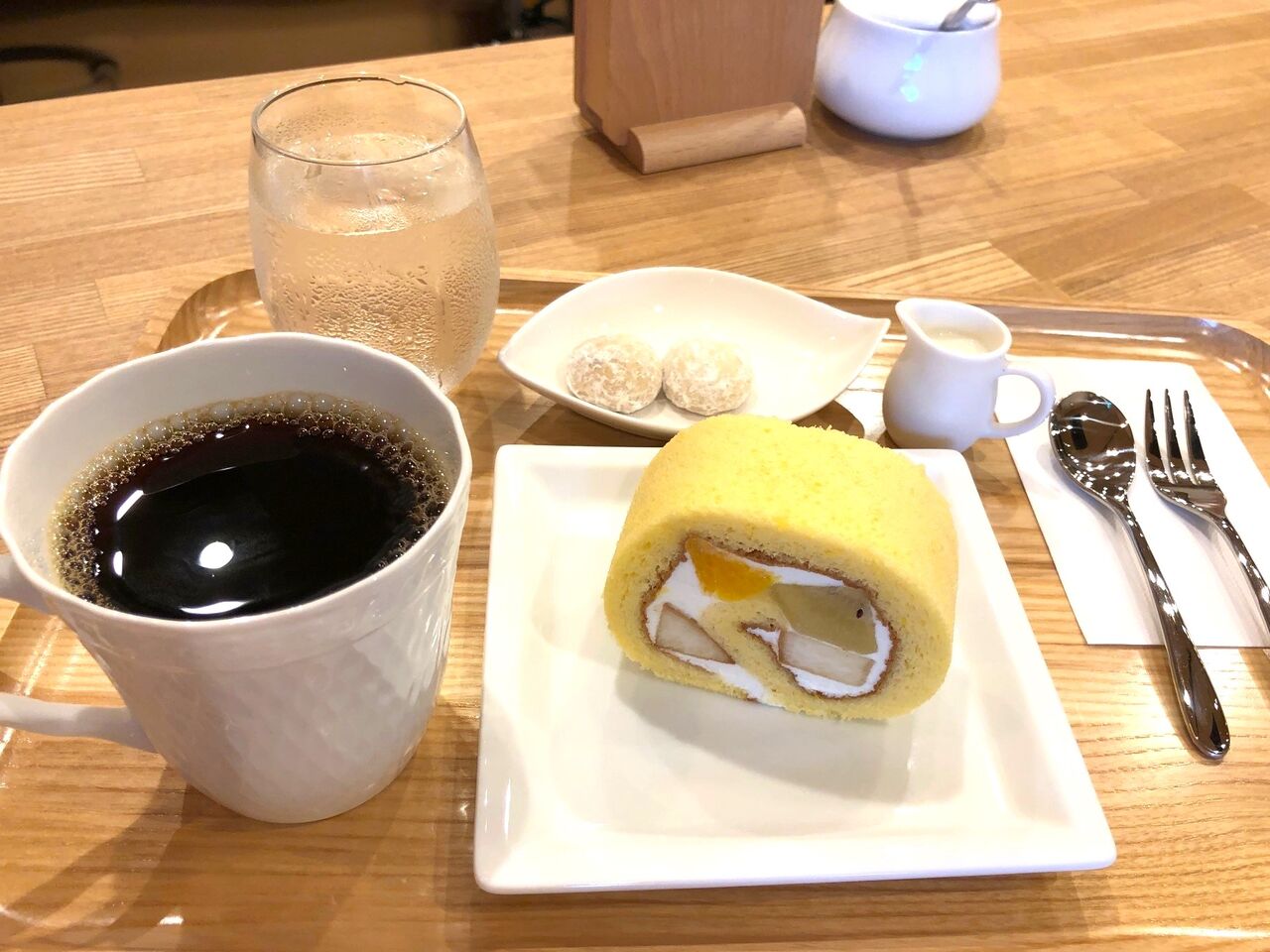 のどかは、レジで先に注文してお金を払うスタイルです。洋梨のタルトとどちらにしようか悩みましたが、季節のフルーツロールケーキを選択。
