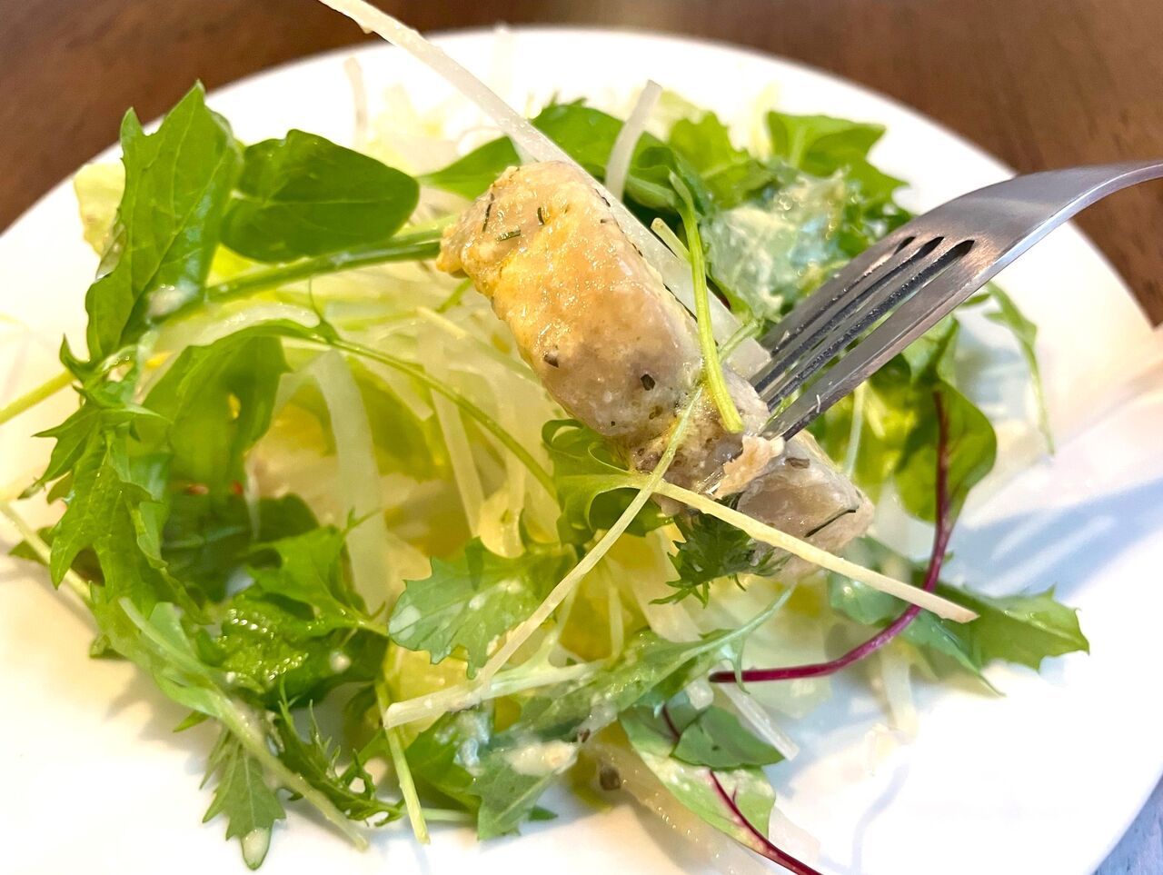 新鮮なお野菜の下からはお魚がお目見え。ドレッシングも爽やかな味でとても美味しいサラダ。メインへの期待が高まりますね。