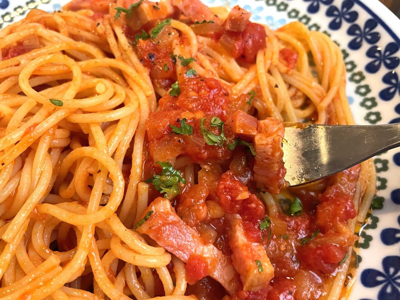 フレッシュトマトからつくられているソースはほどよい酸味と甘さがあり、ゴロゴロと入っている厚切りベーコンやパスタに濃厚に絡みます。