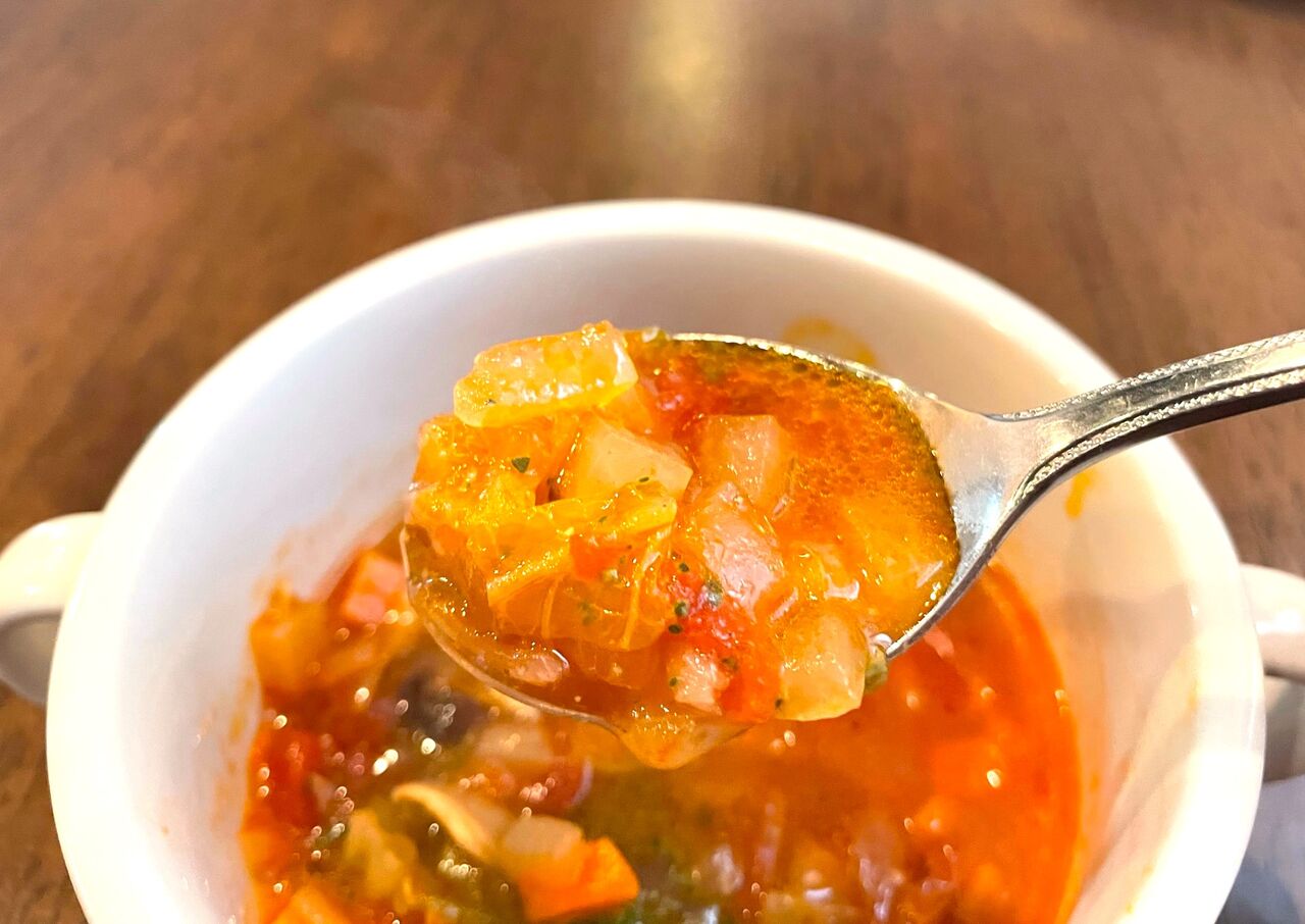 次はスープ。本日のスープは「ミネストローネ」です。