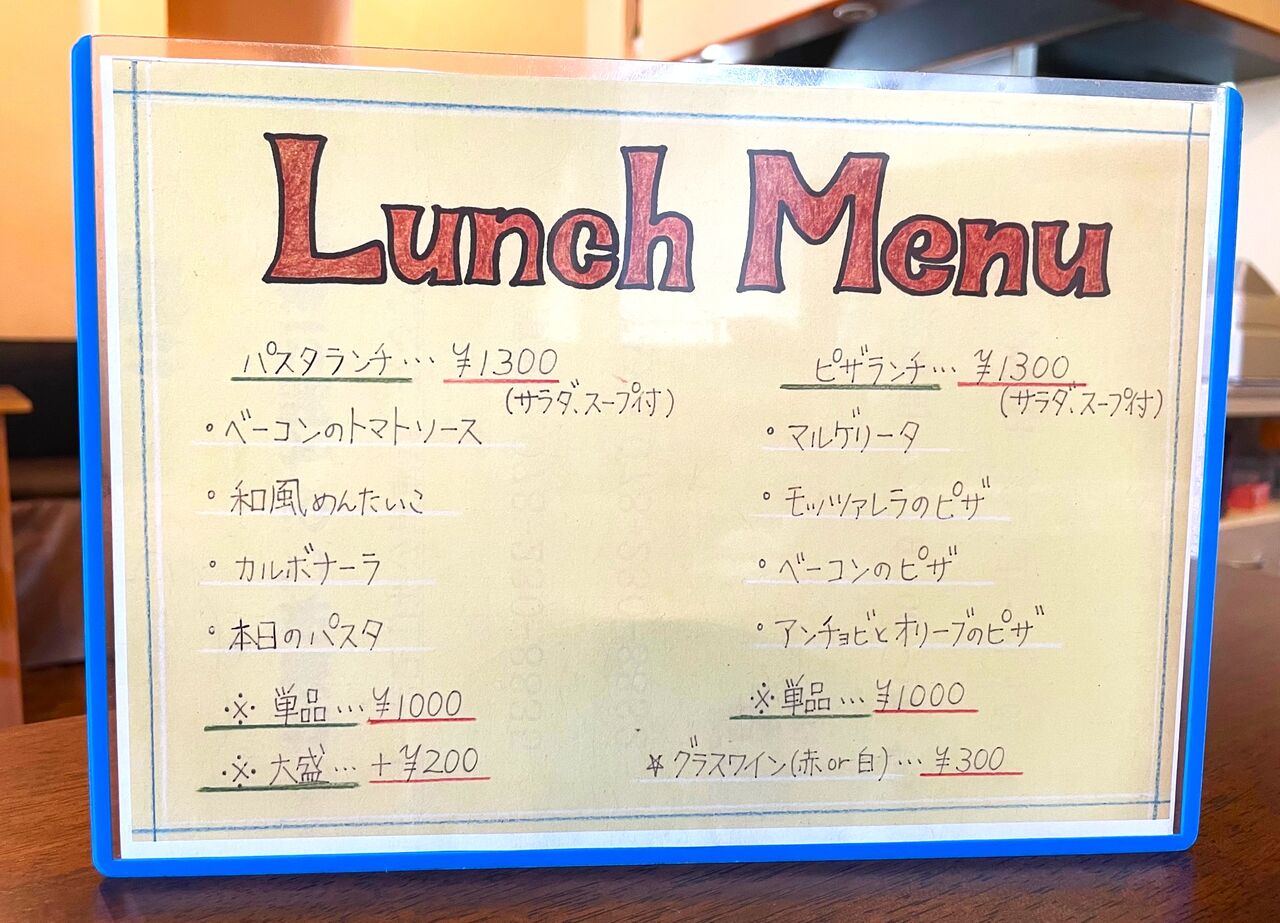 ランチメニューは「パスタランチ」と「ピザランチ」。パスタとピザはそれぞれ数種類から選ぶことができ、サラダとスープがセットでどちらも1300円です。単品なら1000円、大盛りは+200円のよう。