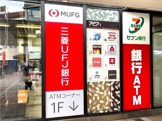 こちらは、阪急逆瀬川にあるアピア1です。セブン銀行ATMや三菱UFJ銀行ATMもあります。ショッピングセンターにあるのは便利です。